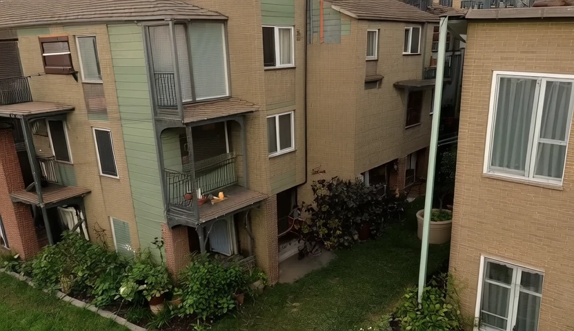 Now we're talking. Actual apartment complex, realistic lighting, muted tones.